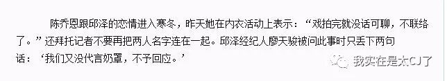 而邱泽的态度却激怒了陈乔恩,陈乔恩的经纪人被问陈乔恩的邱泽的恋情,用了“男未婚,女未嫁”这种几乎是承认关系的措辞,而邱泽则明显不想承认。