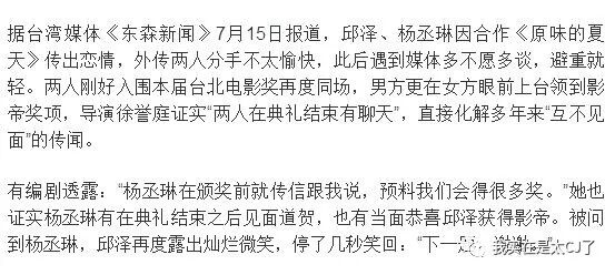 当然,谈到被邱泽伤得最深的一任,也许是杨丞琳。这是邱泽出道后被爆出的第一段绯闻。两人也是因戏结缘: