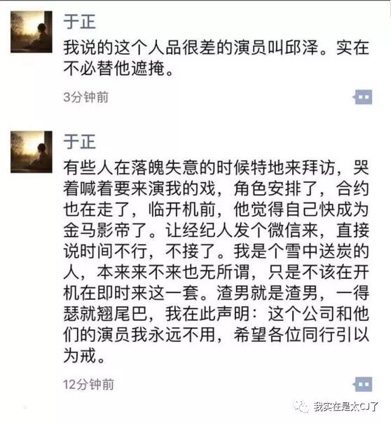 而从于正朋友圈流传出来的截图,用词更是“刚”