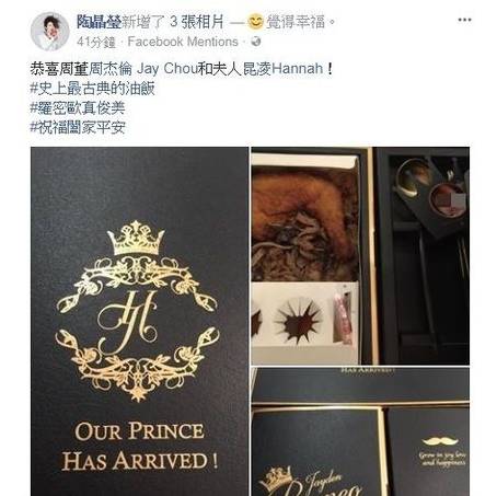 陶晶莹分享收到周杰伦儿子Romeo弥月油饭的喜悦,却不慎让周杰伦儿子的正面照曝光。
