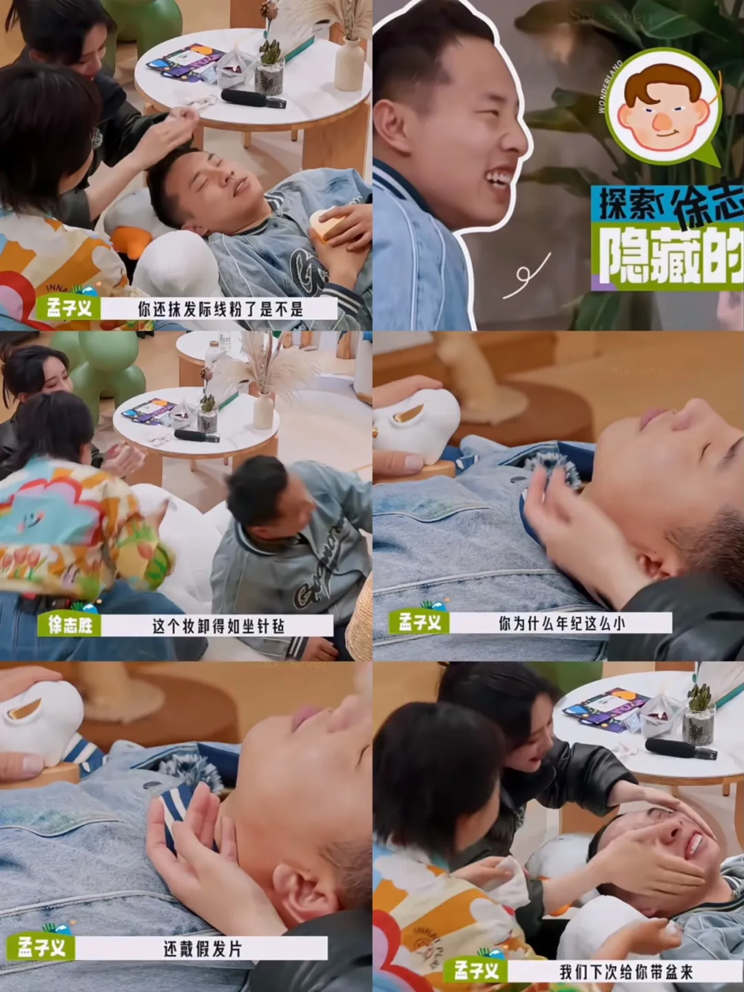 扮演工作人员,给徐志胜卸妆,把徐志胜化妆秘密揭露无疑。第一,底妆厚;第二,脑门大,涂了发际线粉;第三,戴了两个假发片,众人哄堂大笑。