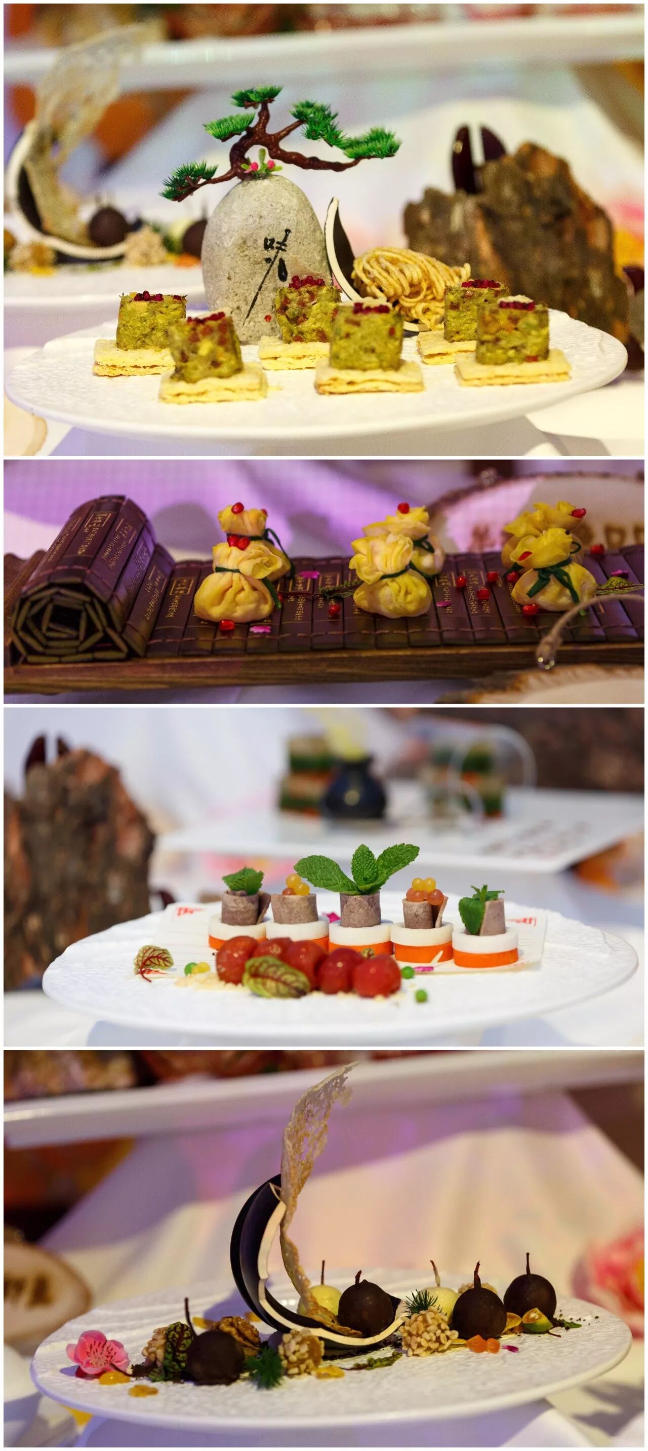 蟹粉鳄梨哒哒:鳄梨又称牛油果,将其和蟹粉等原材料采用西式手法进行制作,并配以中式酥皮达到中西合璧,风味独特的效果。锦囊如意包:南北两地水果相结合,搭配虾仁,口感清香爽口,易消化。恰玛古酱牛舌:恰玛古号称新疆小人参又称长寿果。与牛舌进行搭配起到了补脾胃、益气血、强筋骨、消水肿等功效。鹅肝和巧克力完美结合,入口即化,给人甜蜜梦幻的美妙感觉。
