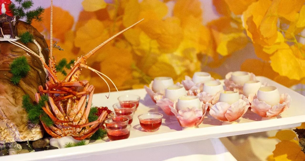 以龙虾为原料,运用中国元素,盛开的牡丹表现人们对美满生活、富有和高贵的向往。