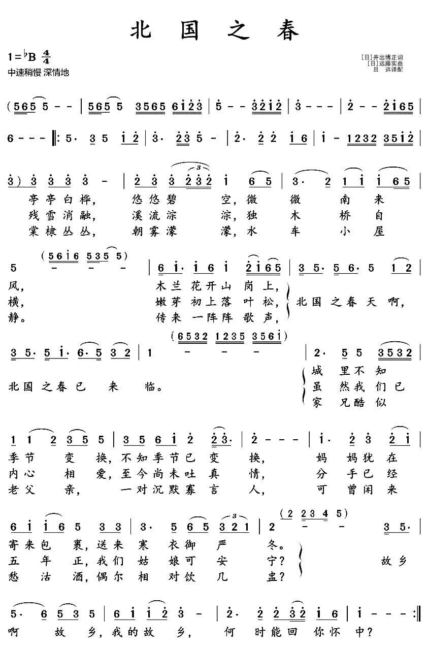 可能许多人像我一样把这歌当成中国歌曲来品赏却毫无违和感,首先它的旋律构成用的是中国五声调式的“1、2、3、5、6”,而非日本国粹调式的“6、7、1、3、4”,这是非常重要的一点,所以说它是中国风的旋律也没错。类似的受国人喜爱的日本歌曲还有谷村新司《星》——巧合的是这两首歌都用到“65 321 2-”这句旋法,这在整首歌中是荡气回肠外的尘埃落定,有了它,才有无论起句还是结尾的的高扬下,风筝飞翔般线在手中的底气与根基。《北国之春》旋律句式工整的外表下,音程跳进和节奏却不拘一格,富于变化,形成一种外在跌宕的抒情和内在宁和的美感,所谓荡气回肠就是这种。