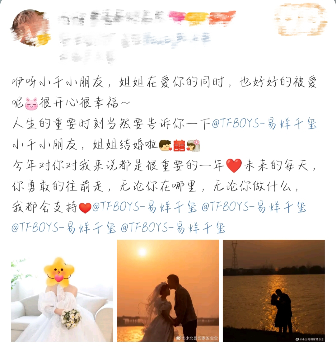 易烊千玺粉丝结婚,决定把人生最重要的时刻告诉他 偶像说 内地男星 2022-08-17 20:30:07 747 创作不易,用心坚持,欢迎请BaGua喝几杯爱心咖啡!打赏并支持本文 打赏并删除本文 今天有一个千纸鹤姐姐把自己结婚的消息上传到了社交平台,千纸鹤姐姐表示,要把自己人生的重要时刻告诉千玺小朋友,言辞间满满都是幸福。千纸鹤姐姐还说,“姐姐在爱你的同时,也好好的被爱呢。”可以看出来,千纸鹤姐姐在追寻千玺的同时,也在好好地过着属于自己的美好人生。祝福我们千纸鹤姐姐新婚快乐,永远幸福下去。千纸鹤姐姐发文并艾特了千玺,给千玺“小千小朋友”的称呼也满是亲昵和宠爱,小姐姐还晒出了自己的三张婚纱照,有两张和自己老公的合照,看起来很是甜蜜,还有一张是自己单人的,手捧鲜花身穿白纱,也是非常唯美,相信千纸鹤姐姐也是收获到了甜甜的爱情吧。千纸鹤姐姐提到,今年对千玺和自己都是最重要的一年,对于小姐姐来说,可能在今年选择了进入婚姻,所以是自己人生中很重要的时间节点。而对于千玺来说,今年也是大起大落,确实成为了不太平凡的一年。尽管如此,千纸鹤姐姐仍然坚定不移地告诉千玺,“未来的每天,你勇敢的往前走,无论你在哪里,无论你做什么,我都会支持。”千玺出道至今已经九年有余,随着年岁的增长,千玺也马上到法定结婚年龄了,许多陪伴千玺长大的千纸鹤也长大了,也许慢慢地,更多女孩也会步入婚姻,为人妻为人母,千玺最后也会有自己深爱的人,但相信,无论是千玺还是千纸鹤,都会在自己的人生轨迹上越来越好。我们和千玺互相陪伴,彼此成就,最后各自安好。 创作不易,用心坚持,欢迎请BaGua喝几杯爱心咖啡!打赏并支持本文 打赏并删除本文 感谢您的支持鼓励,我会继续努力的!文章地址:用户邮箱:打赏金额:USDT 请输入数字点击”去打赏“,即可进行打赏支持本文章哦 易烊千玺 About the Author 偶像说 功能介绍:这里有很多个明星,但是我们最爱讲TFBOYS的事情,有关三小只的小秘密你想听嘛? Related Posts 黄子韬徐艺洋餐厅约会被偶遇,戴情侣帽秀恩爱,却互不搭理显冷漠 2023-02-15 22:40:08 伊能静带7岁女儿小米粒回台北探亲,网友:比大s识大体! 2023-02-03 23:09:13 网传TFBOYS十周年演唱会完成备案,时间跟李飞说的对上了! 2023-02-02 23:54:30 蔡少芬深夜陪老公玩穿越机,炫耀:我男人没有我不成!夫妻合照好甜 2023-01-06 23:31:16 黄景瑜工作室告黑胜诉,历时已久,终于守得云开见月明 2023-01-06 23:31:16 发表评论