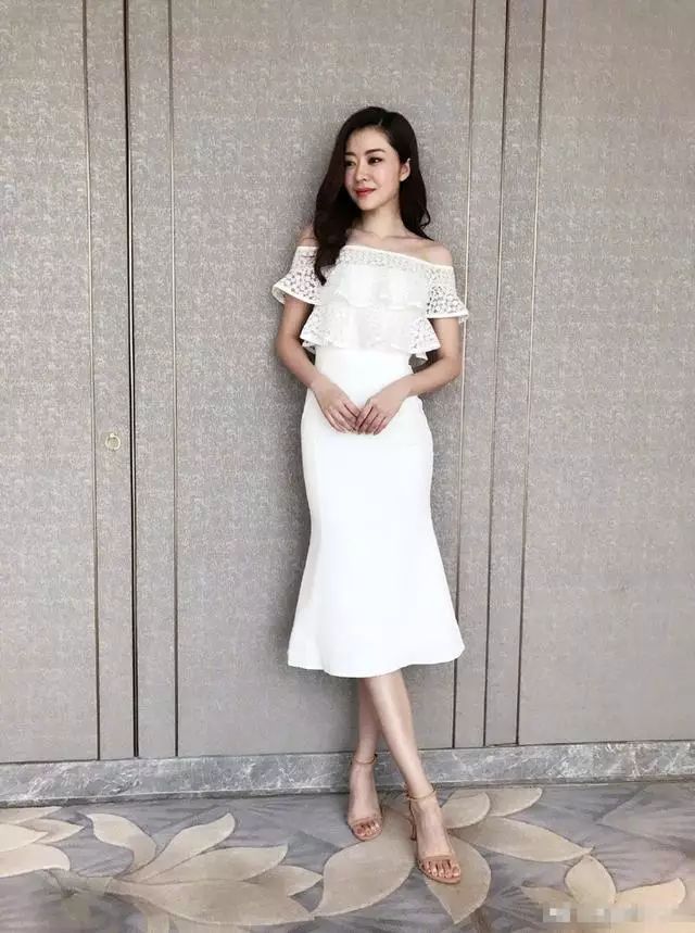 白色一字肩连衣裙搭配裸色的一字带高跟鞋,性感的锁骨和完美身躯尽显,侧边大波浪卷发的熊黛林温婉大气,女人味十足!