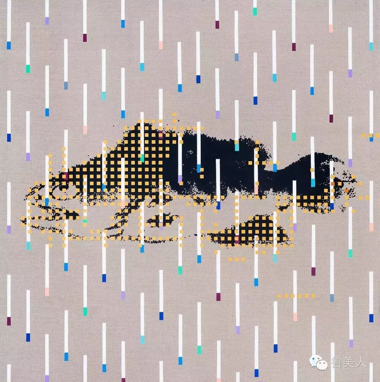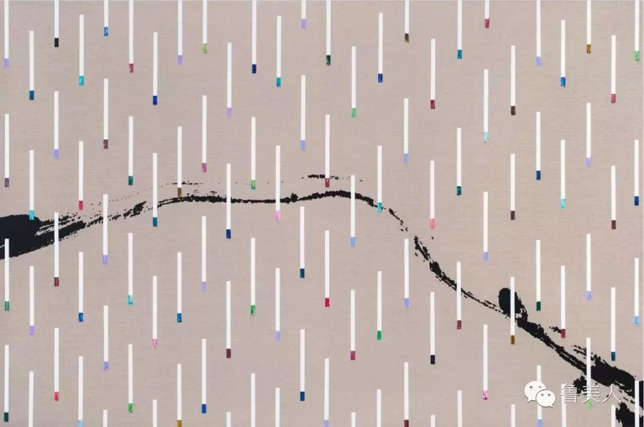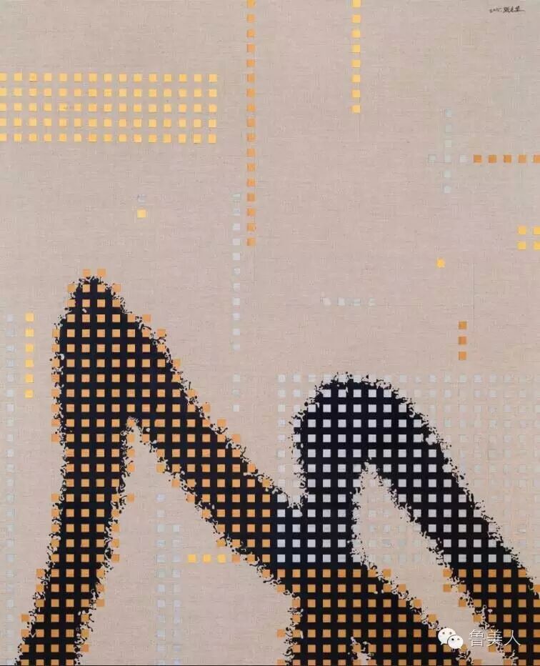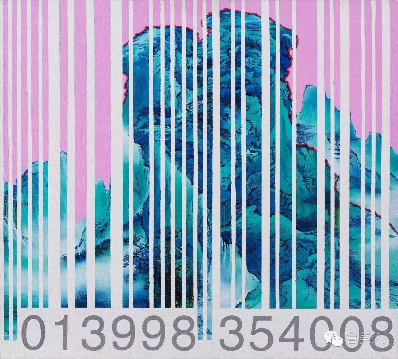 虽然这两种创作方向在2013年以来的创作中并未得以延续,但就艺术家个人创作观念而言,却没有太大的偏离。一方面是如何在绘画中注入观念性。在张志坚看来,首先要摒弃语言的工具性,亦即是说,画面中的语言既不是描绘的、叙事性的,也不负载造型的功能。这就意味着,学院意义的技巧与修辞方式将会失效。如果语言不为造型服务,也不为形象服务,作品的意义生效就会由形式来承载。于是,如何将形式观念化成为了接下来的问题。在《作品10号》、《作品12号》中,形式并不来自对表象世界的抽离,也不是现代主义意义上的“有意味的形式”,相反具有反题材、反叙事性的特征。另一方面是为作品构筑一种社会文化语境。在《作品15号》、《作品18号》中,画面出现的图像、数字,以及作为条纹的视觉形式都具有意义索引的作用。青绿的“山石”不仅具有图像的特征,而且在既有的审美经验中,会使其与传统文化在审美趣味上发生关联。数字与条纹暗示消费文化、流行文化的存在。然而,当两种不同的视觉形象并置在一起时,视觉形象中原有的意义就处于一种砥砺与碰撞的状态。形象的平面化、图像的符号化、色彩的波普化共同使作品具有现代感,但对于艺术家而言,一个基本的目的,仍然是让作品与外部的文化现实发生联系。很显然,绘画的观念性,以及为作品构筑一种当代文化的情景始终是这一阶段艺术家思考的问题。同时,它们也犹如两极,形成了独特的张力,艺术家后来的创作更多的时候是游走其间,在处理不同的主题时,也各有侧重。