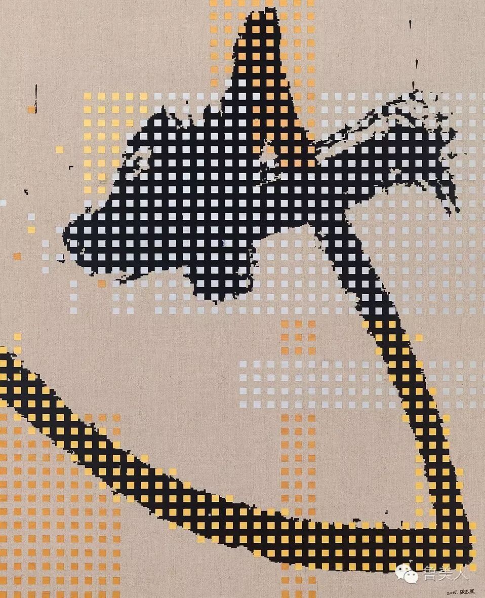 《系辞传·下》中有这样的描述,“古者,包栖氏之王天下也,仰则观象于天、俯则观法于地,观鸟兽之文与地之宜,近取诸身,远取诸物,于是始作八卦,以通神明之德,以类万物之情。”换言之,中国的汉字不仅脱胎于最初的“象”,而且从一开始,“象”于“意”是集于一身的。如果用索绪尔的语言学理论予以解释,能指与所指会形成一个相对自律的意义链。为了削弱“意”对形象的干扰,张志坚将这些汉字进行了拆解,使其丧失可识别性。一旦这些文字无法阅读,那么,它们就只是一些孤独的能指,在场的仅仅是一些抽象的视觉形象。如此一来,所指就缺席了。惟其如此,艺术家才能让创作的重点重返艺术语言本身。不难发现,不管是早期作品中的“山石”、各种来源于传统绘画中的动物形象,以及抽象的书法,张志坚都希望立足于中国传统的文化与视觉资源,然后对其进行当代性的转换。于是,在艺术家的作品中,我们会看到两种语言方式,或者两条视觉逻辑之间的博弈与互渗。一方面是抽象的、书写性的、具有东方意象表现的视觉符号,另一方面是代表西方现代绘画语言特征的那些抽象的、理性的、结构化的形式,它们都同时出现在一个画面意义系统中。于是,感性与理性、意象与波普、东方与西方的视觉特征共同赋予作品一种独特的张力。