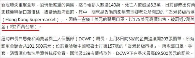 5月16日,有台媒报道称54岁香港前影星叶玉卿老公的超市将一盒价值10美元的医用口罩,以175美元的高价出售(溢价10倍之多),因此被当地罚款近7万美金(折合RMB:490000,近50万元)。