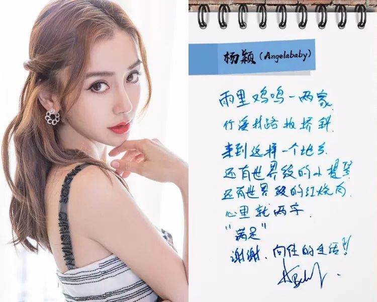 Angelababy(杨颖)在内地真人秀《向往的生活》,节目在微博公开其亲手字迹,但字写得歪斜且大小不一吓坏内地不少网民,嘲笑指「就是小学生的字。」