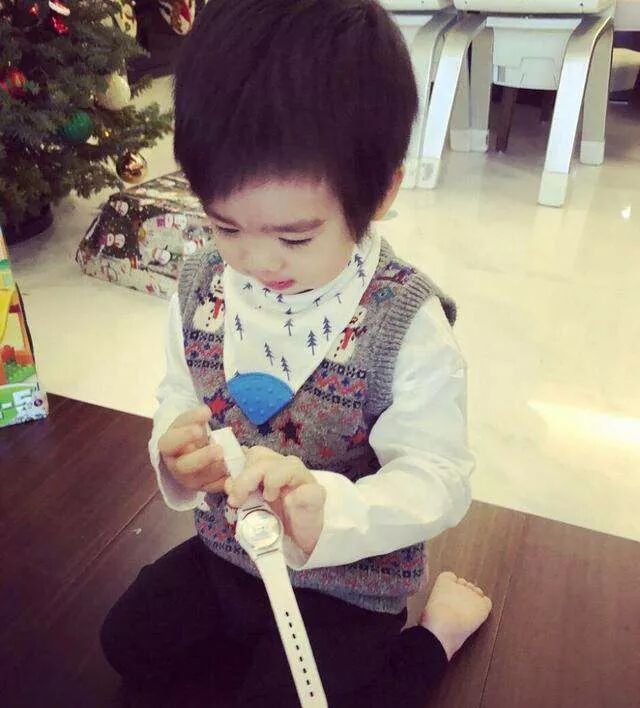 Jenson跪坐在地上,皮肤白皙,睫毛根根分明,小嘴巴红彤彤的,颜值超高。只见Jenson手里拿着一只白色的手表专心致志地玩了起来……莫非小志爸比送的真是手表?哈哈哈,难道不应该是遥控赛车之类的玩具嘛!要知道Jenson是睡觉都抱着遥控器的小朋友呐!