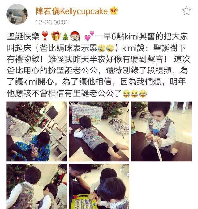 12月26日零点零一分,林志颖的爱妻陈若仪居然选择在圣诞节后分享了一家人过圣诞的画面,也是非常有与众不同了!陈若仪称kimi早上六点钟就兴奋地把一大家子全都叫起床,并兴奋地说:圣诞树下有礼物诶!难怪我昨天半夜好像有听到声音!爸比妈咪无奈也得跟着醒来,要知道为了让kimi开心,让kimi相信圣诞老公公的存在,礼物可都是林志颖扮成圣诞老人派发的哦,还特意拍视频证明!言外之意就是考虑到明年kimi9岁应该就不会再相信有圣诞老人了吧,到时候不好忽悠了,不知道我这样理解对不对哈!