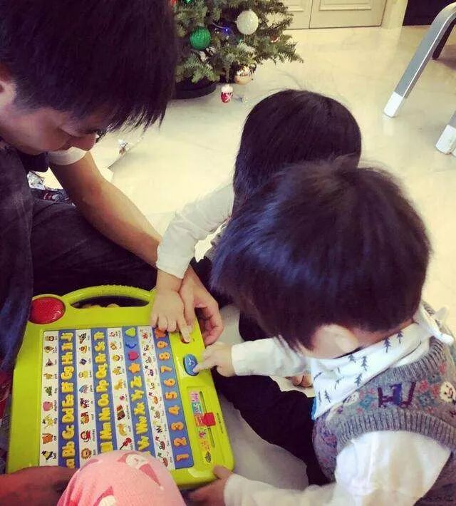 林志颖从昨晚的圣诞老人恢复到今天的小志爸比,和宝贝们一起玩起了圣诞礼物。上面有字母,有数字,想必是Kyson的最爱了!两岁的弟弟Kyson可是能轻松认读26个英文字母的聪明小孩儿哦!两小只还尝试着去摁各种颜色的按钮,听各种声音,我们的好奇宝宝再次上线!