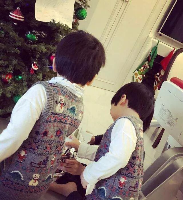 与kimi形成鲜明对比的是淡定的双胞胎弟弟,两小只穿得整整齐齐地来到圣诞树前,白色衬衫,配圣诞主题的毛线背心,看起来干净又帅气!画面中左边的小朋友是哥哥Jenson,右边是弟弟Kyson。Kyson居然帮着kimi一起拆包装,歪着小脑袋的样子简直萌化了!