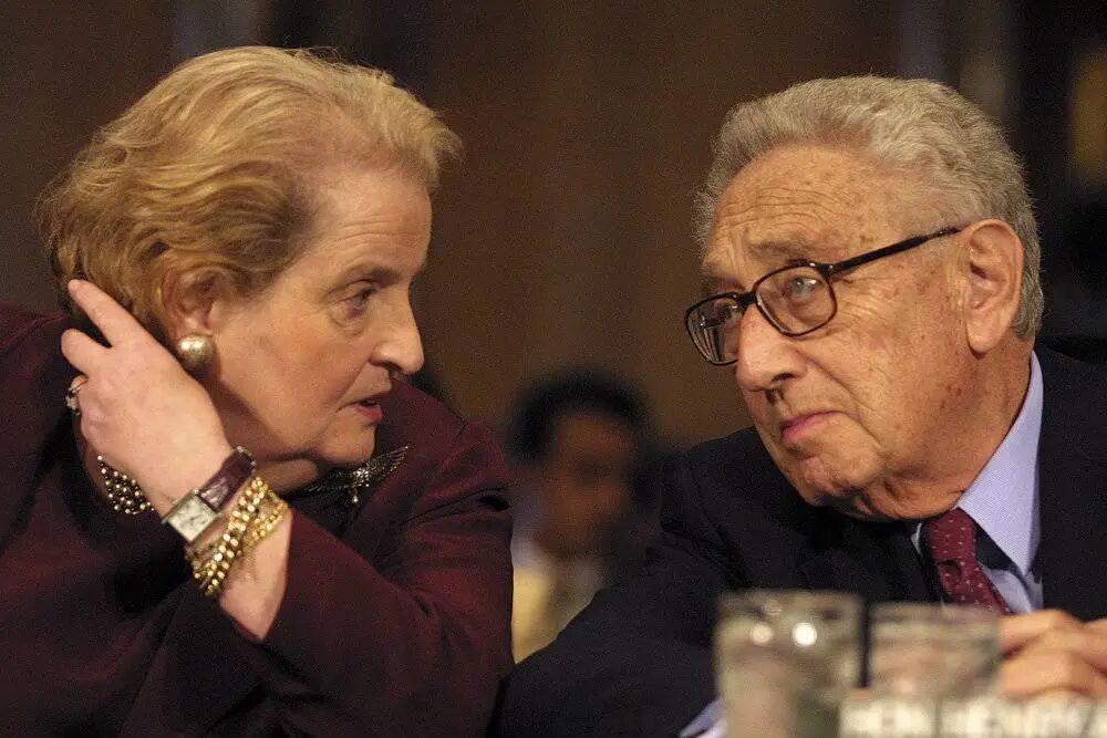 奥尔布赖特(左,右为基辛格)认为,女生该勇于认领自己的成功 / 图片来源:CFP