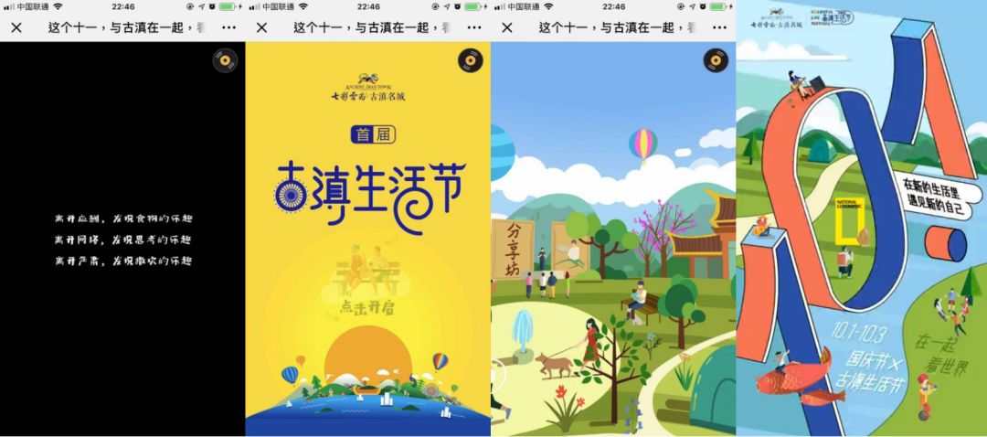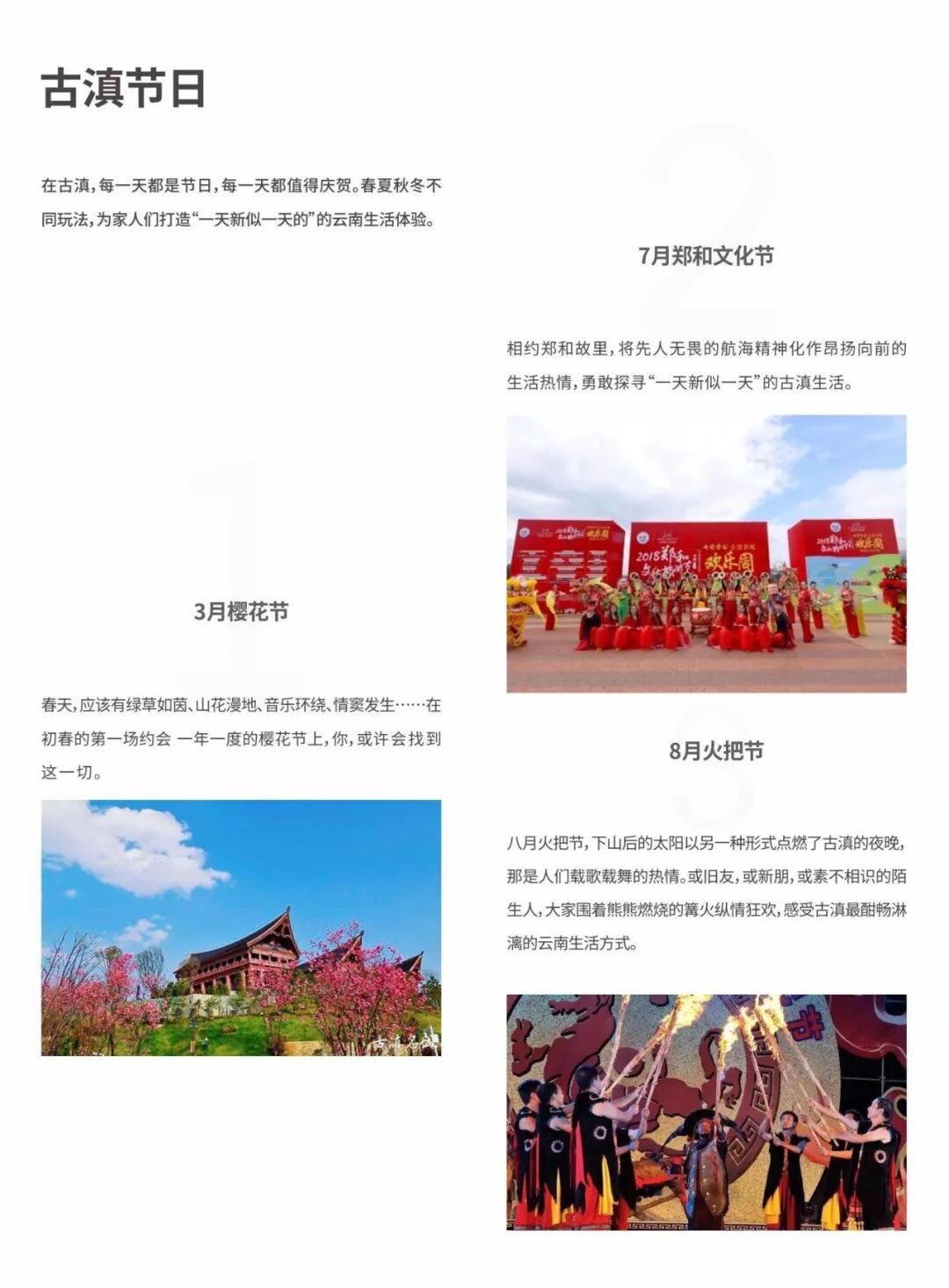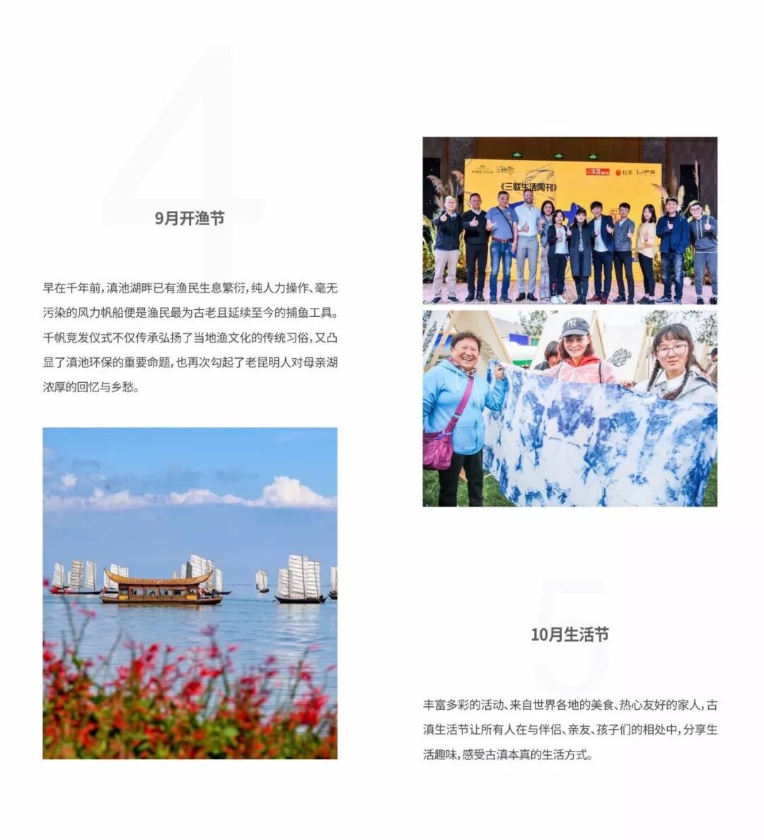 2018年10月1日 - 10月3日,首届古滇生活节在七彩云南·古滇名城盛大启幕,无忧之城音乐节『自然纪』及『狂欢纪』、《三联生活周刊》云南范儿分享坊、拾光畅乐夜·业主联欢会、阿卡贝拉亲子营、IMark低碳定向跑、文创手作市集、云合国美食集、秘密花园生活手作、开渔节等一系列活动,精彩纷呈。
