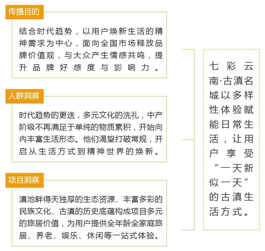 1. 城市文化思维。顺应旅居时代发展趋势,以品牌精神价值的多维发声,深度解读最云南的生活方式,激发用户集体共鸣与品牌归属感,为现代文明打开一个窗口,携手用户抵抗时代焦虑。