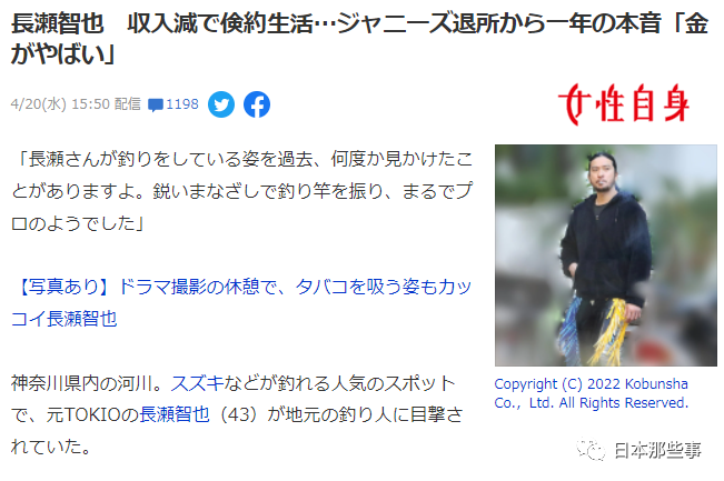 长濑智也最近被目击出现在神奈川县一条河边钓鱼,这位目击者称已经见过长濑智也好几次了,他挥舞鱼竿的时候,眼神非常犀利,像专业钓鱼的人一样。