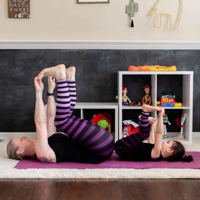 快乐婴儿式——这个体式宝宝应该会很喜欢的。