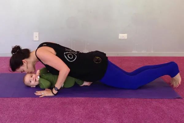 膝板俯卧撑亲吻:这个姿势的开始位置与猫和牛的姿势相同,但膝盖向后靠在垫子上,脚趾收起来。吸气,然后在弯曲肘部的同时呼气,保持肘部向两侧收拢,然后慢慢将自己放低,靠近宝宝,直到足够接近可以亲吻鼻子或额头。吸气将自己压回原位。重复5-10次。这个姿势有助于发展核心力量,也可以锻炼你的三头肌。