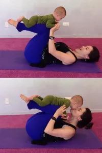 抬腿宝宝:膝盖弯曲,宝宝靠在你的小腿上。抱住宝宝并亲吻宝宝,让宝宝面对面地在你上方。握住宝宝的手或身体,左右移动双腿,前后移动,上下移动小腿。这是一种有趣的方式来练习骨盆底并用你的宝宝作为重量来加强你的核心。