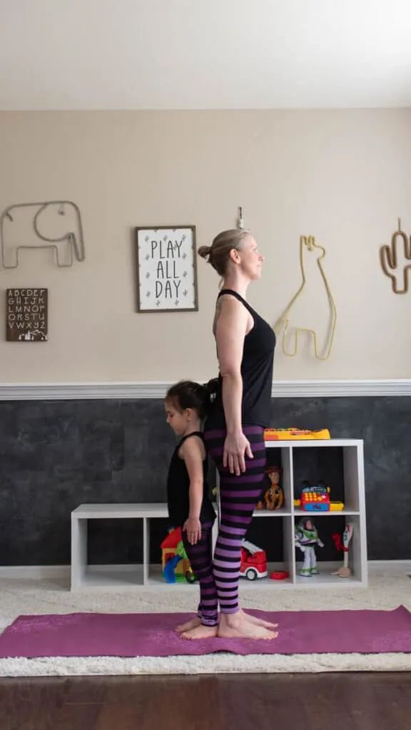 双脚并拢站立,双手放在身体两侧,同时与宝宝背靠背站立。收紧大腿并在拉长脊柱的同时思考你们哪一个能站得像山一样高大壮!