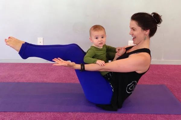 摇船宝宝:坐在垫子上,双腿弯曲,让宝宝坐在你的腿上,面对你。抱着宝宝,慢慢抬起双脚,直到双腿与地板平行。保持在这里呼吸或慢慢伸直膝盖。尝试保持姿势 10-20 秒。非常适合增强腹部力量!
