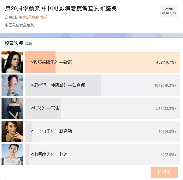 白百何凭借《滚蛋吧,肿瘤君》中精彩的表现,票数遥遥领先,紧跟其后的是宋佳、舒淇、蒋勤勤、赵涛。