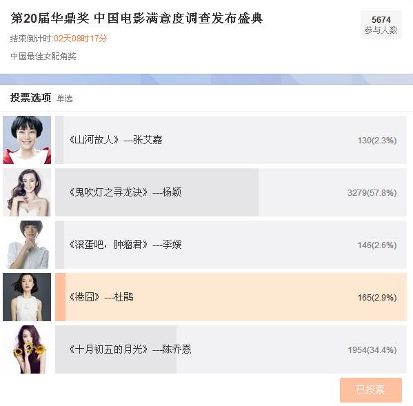 杨颖凭借《鬼吹灯之寻龙诀》中的角色,获得提名,并且票数暂时领先紧跟其后的陈乔恩!