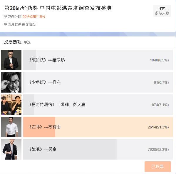 吴京导演的《战狼》口碑和票房都取得了不错的成绩,在这一项提名上,吴京以62.3%的票数处于第一的位置。