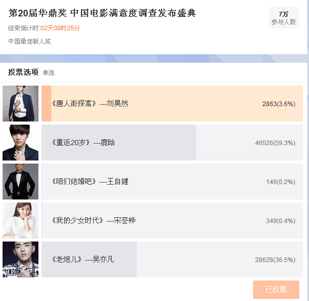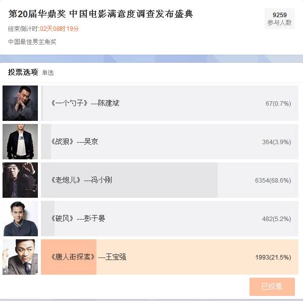 从目前的投票情况来看,冯小刚凭借《老炮儿》里面的角色获得最高票数,紧跟其后的是王宝强、彭于晏、吴京、陈建斌。