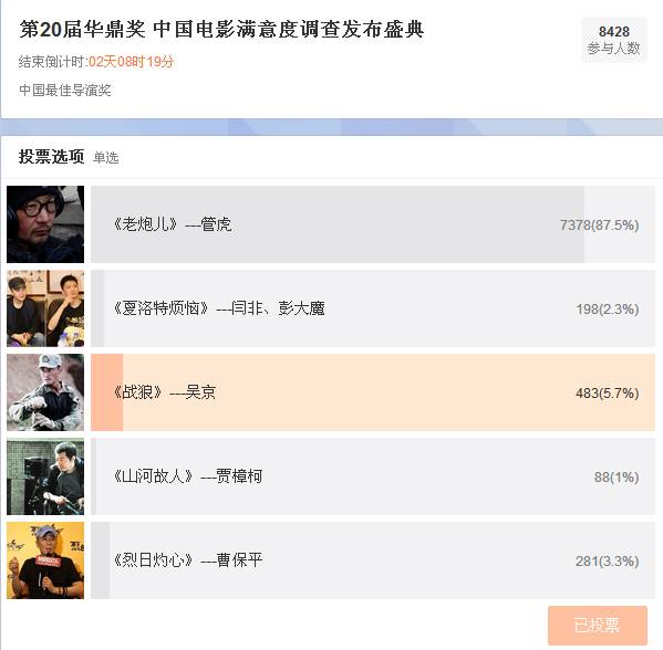 管虎凭借《老炮儿》获得了87.5%的投票,处于第一的位置!