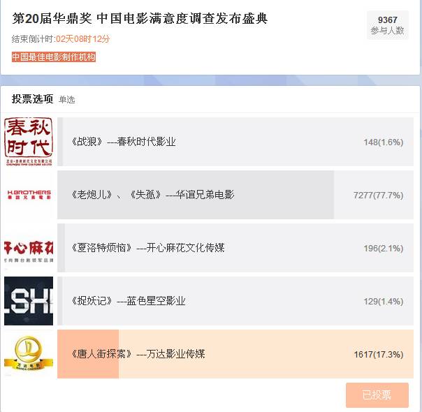 华谊兄弟凭借《老炮儿》、《失孤》等优秀的作品票数遥遥领先,获得了77.7%的投票率。