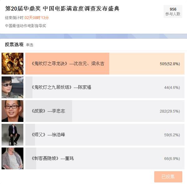 《鬼吹灯之寻龙诀》在这一奖项上的投票暂时位居第一,想必观众们还记得里面精彩的打斗场面吧,紧跟其后的是《战狼》等影片。
