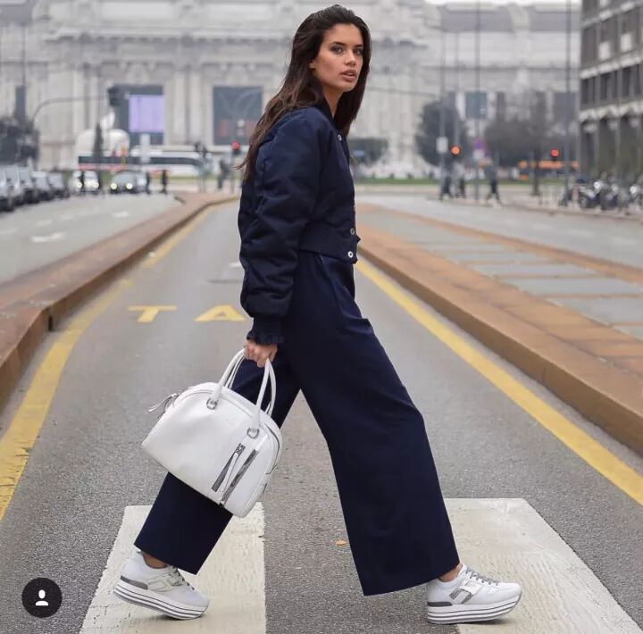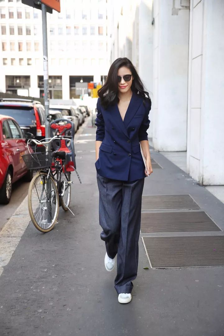 ▲阔腿裤与白色运动鞋的搭配,轻松穿出摩登的简约风格。鞋跟处金属色的巧妙点缀,让灰白的冷色系配色多了点睛之笔。