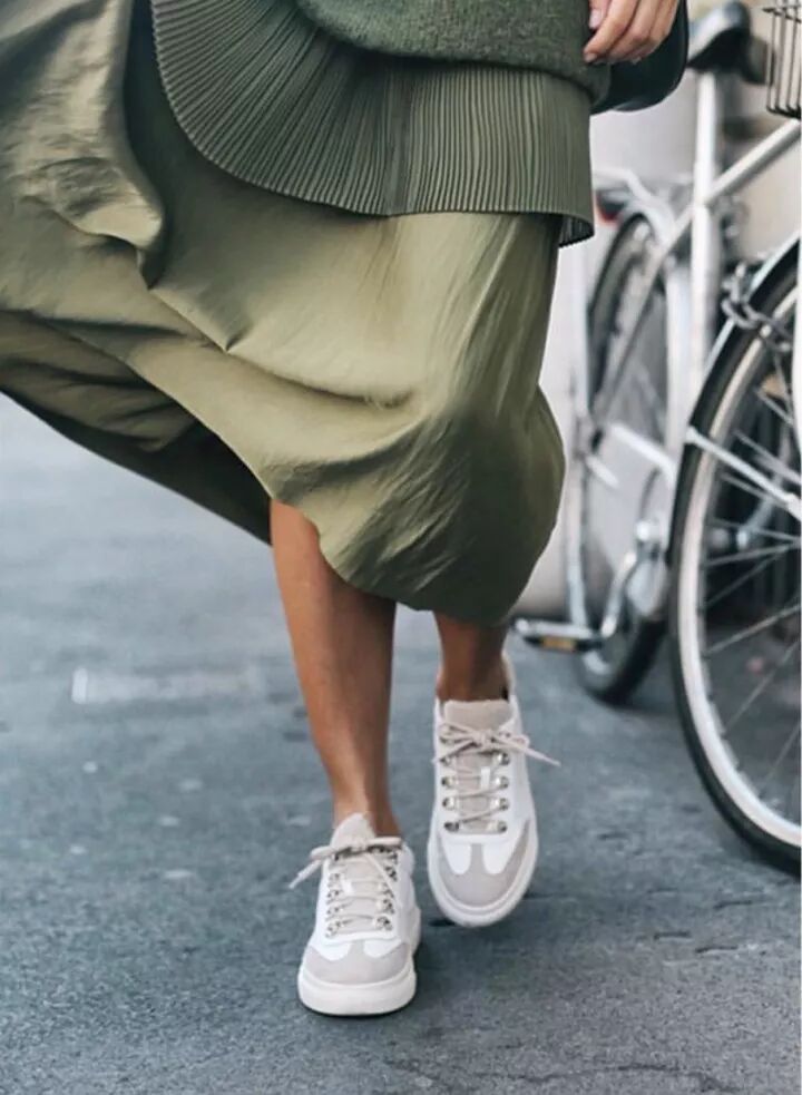 ▲职业感的针织半裙,也并不是只有平底鞋最登对。整身的米白色针织套装,选一双同色系拼色运动鞋,即舒适又得体。