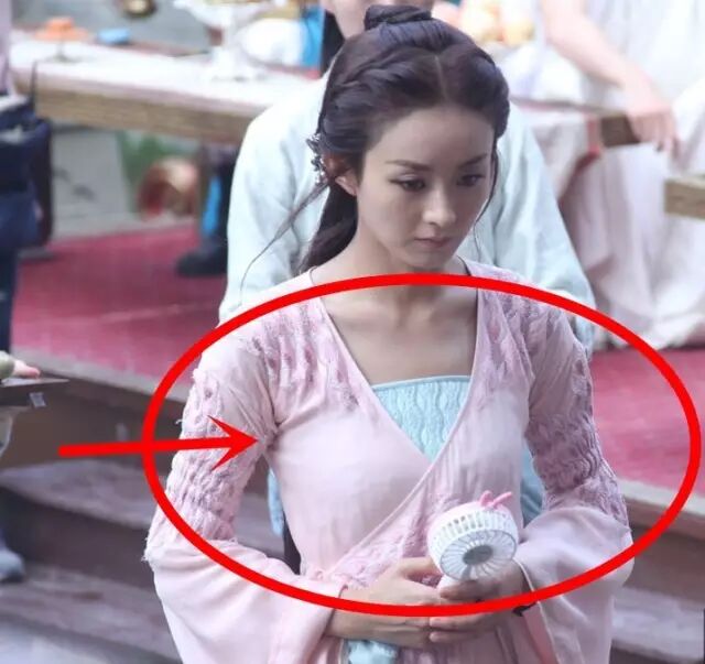 天气太炎热,但是还要穿着厚重的戏服,热的赵丽颖拿着一个小扇子为自己吹风