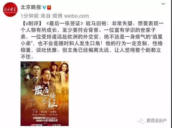 @传媒老王:我认为,《北京晚报》官微对电视连续剧《最后一张签证》的点评非常到位!这部电视剧我看了头几集,就再无兴趣看下去了,算是垃圾剧,很是怀疑这样的剧会有收视率吗?另,据说两位男主演拍这部电视剧的片酬很高。