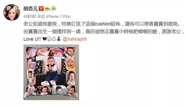 12月20日晚上,胡杏儿晒出一张照片,配文称,“老公知道我要飞,特意订造了这个cushion给我,让我可以带着宝宝到处飞。由宝宝出生一个礼拜到一岁,真的很想念宝宝小时候肥嘟嘟的脸,谢谢老公。”