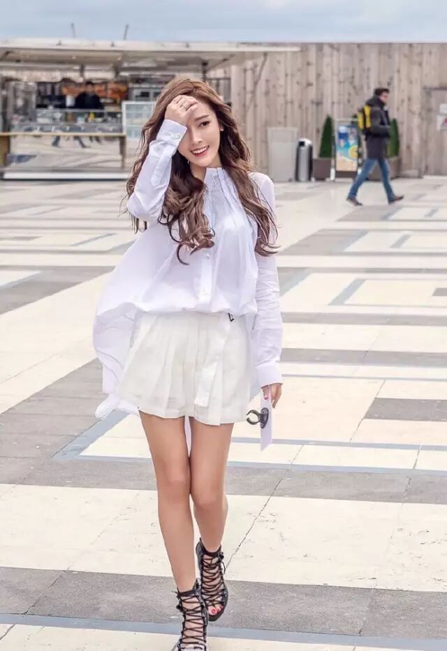 ▼小碎花衬衫有着一种少女的清新感,搭配百褶裙穿出甜美浪漫的气息,简洁精致。像Jessica搭配蓝色的短裙,全身的设计比较有造型、立体感,配运动鞋显得青春活泼,少女范足足的。