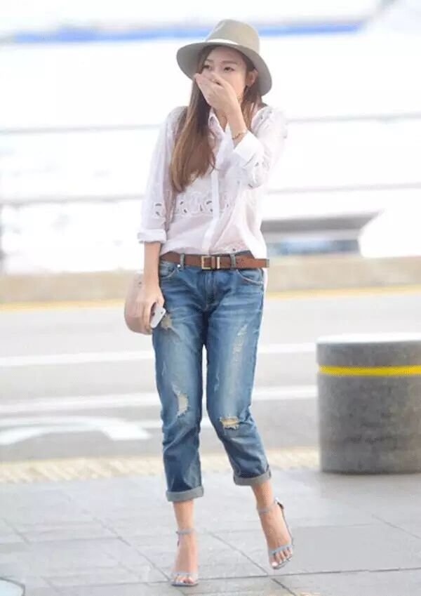 ▼衬衫搭配牛仔裤是郑秀妍出街的时候比较喜欢的造型,都是比较宽松的款式,穿出比较潇洒帅气的味道,展现她干练知性的一面,十分有气场。