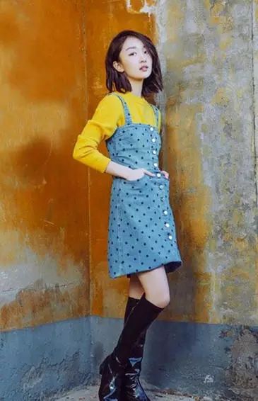 唐嫣、宋佳超爱的牛仔背带裙,周冬雨身为新晋女神肯定不少得。圆点前排扣牛仔背带裙内搭黄色打底,一股春天的气息,搭配的黑色中筒皮靴很显潮范。