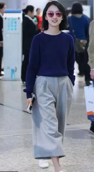 周冬雨穿蓝紫色条纹针织衫搭配灰白阔腿裤,下搭白色休闲鞋青春活力,不过这条阔腿裤略显厚重。但粉色太阳镜又给周冬雨增添俏皮可爱的个性。
