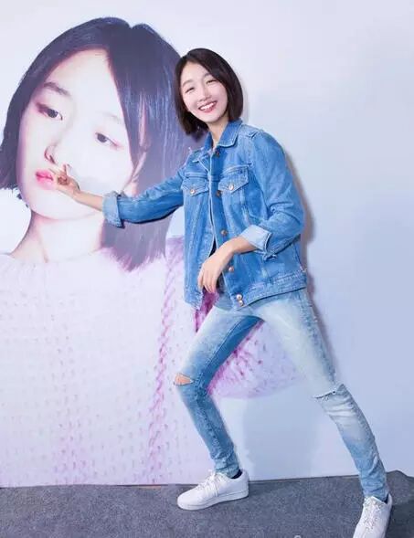 周冬雨短发造型清新爽朗,牛仔外套配破洞牛仔裤,减龄又时尚,脚踩一双小白鞋,十分青春有活力,适合冬雨妹子开朗阳光的个性。
