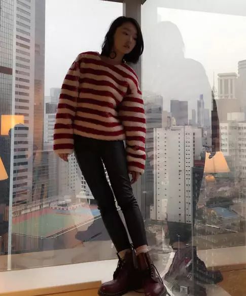 周冬雨身穿条纹衫加皮裤,休闲舒适又凸显身材。酒红色的马丁靴更是潮流时尚,整个搭配十分适合周冬雨的俏皮性格。