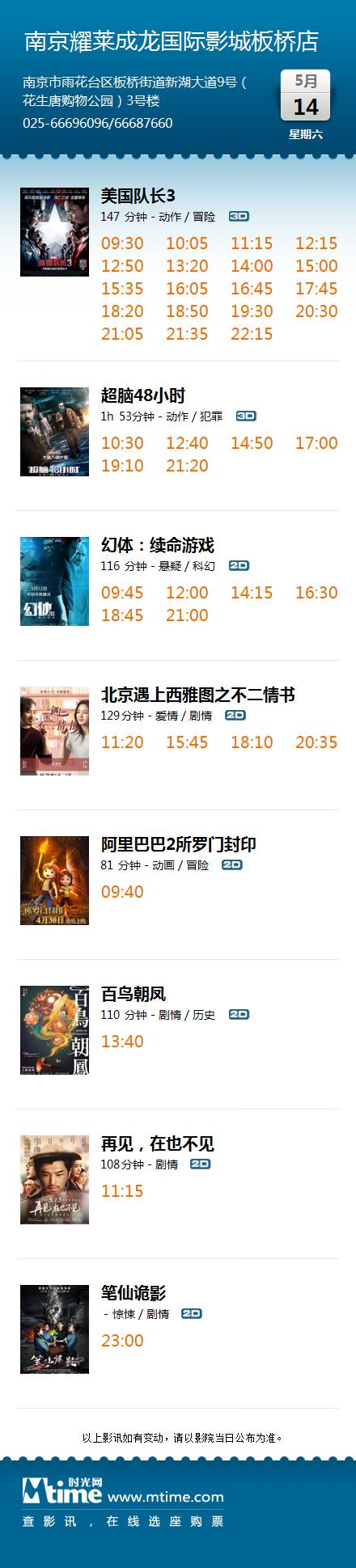 南京耀莱成龙国际影城板桥店5月14日星期六影讯