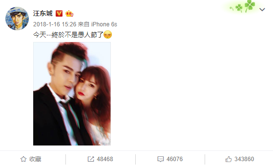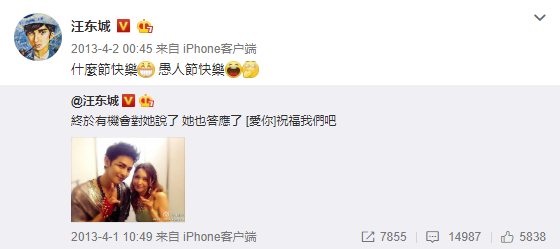 2013年4月1日,汪东城发过一条和她的合照,引起轩然大波,结果是愚人节玩笑。