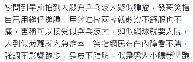 周润发在采访中首次回答了这个问题否认患有肿瘤,笑称是自己用锤子锤肿的,平时用药油涂一涂就散开了,没有不舒服也不痛,万一真的变成网球那么大,就要去看医生了。他解释,这些小肉球其实是皮下脂肪,类似于男性常见的小肠气。跑步后这些小肉球就会消散,完全不影响健康。发哥还幽默地吐槽,可能是网友们"白内障"了才会看成肿瘤。