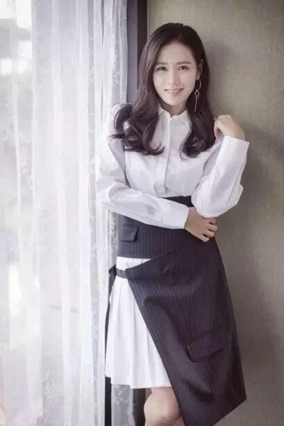 裙子像是男士西装的半边,另一半则是突显女性柔美的白色百褶裙,风马牛不相及的两种Style竟搭配成了一条裙子,斜切边后用丝带捆绑,既有男装的干练,又有女装的柔和。 孙艺珍用白色衬衣搭配,霸气中有带著柔美。