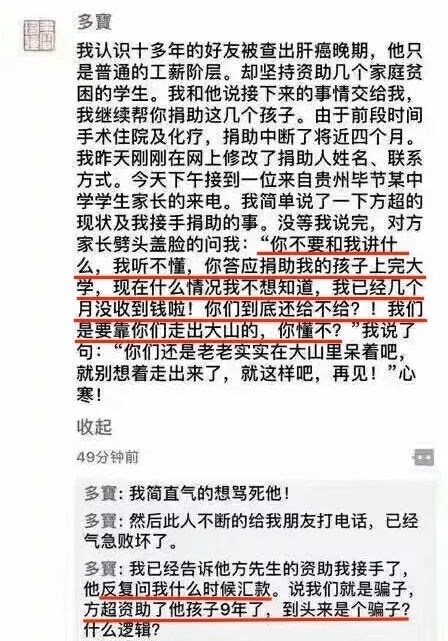 由于朋友化疗、手术等事宜繁忙,捐助还是中断了四个月。没想到遭到被资助家长劈头盖脸的痛骂。